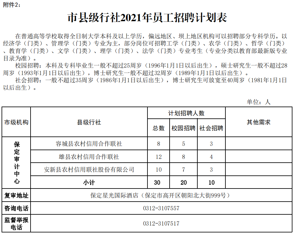 河北省农村信用社联合社现面向社会公开招聘有工作经验人员(现河北农信系统员工和业务岗位劳务派遣工除外)和普通高等学校2022年应届毕业生。其中,雄安新区容城县、雄县、安新县累计招聘30人(校园招聘20人、社会招聘10人)。