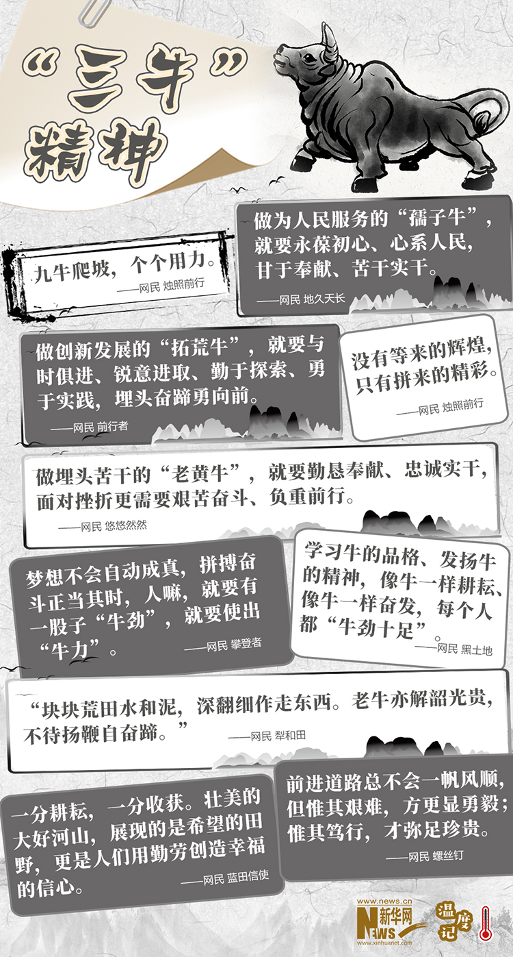 胸中若有凌云志,不待扬鞭自奋蹄。今天的幸福是一点一滴干出来的,追梦人的世界从来没有停一停、歇一歇的懈怠。“学习牛的品格、发扬牛的精神,像牛一样耕耘、像牛一样奋发。”社交平台上,人们热情讴歌牛的品质,汲取可贵的精神力量。前进路上,发扬“三牛”精神,鼓足“牛劲”,充满“牛气”,披荆斩棘、开拓创新、坚毅前行,新时代的中国一定更“牛”!(文字:徐可 海报设计:王晔)