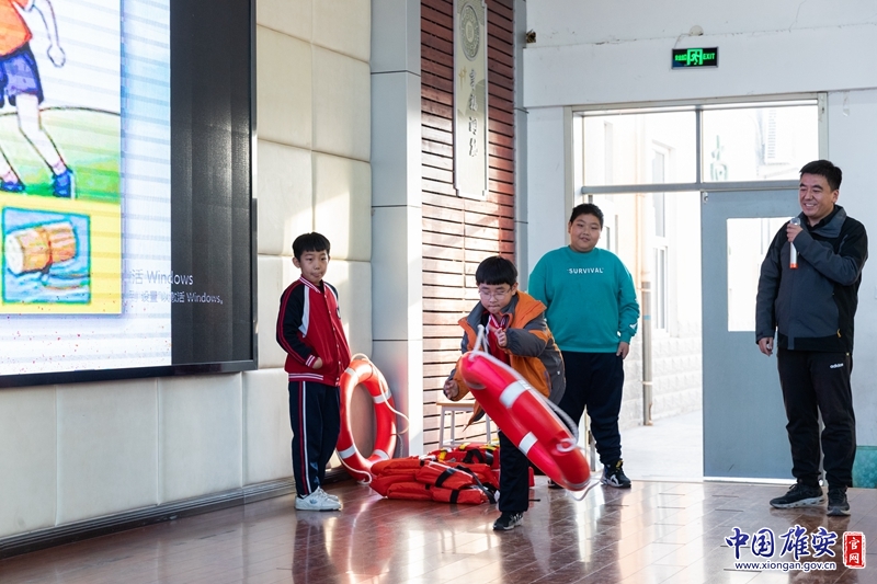 学生上台体验如何正确使用救生圈。中国雄安官网高盟 摄