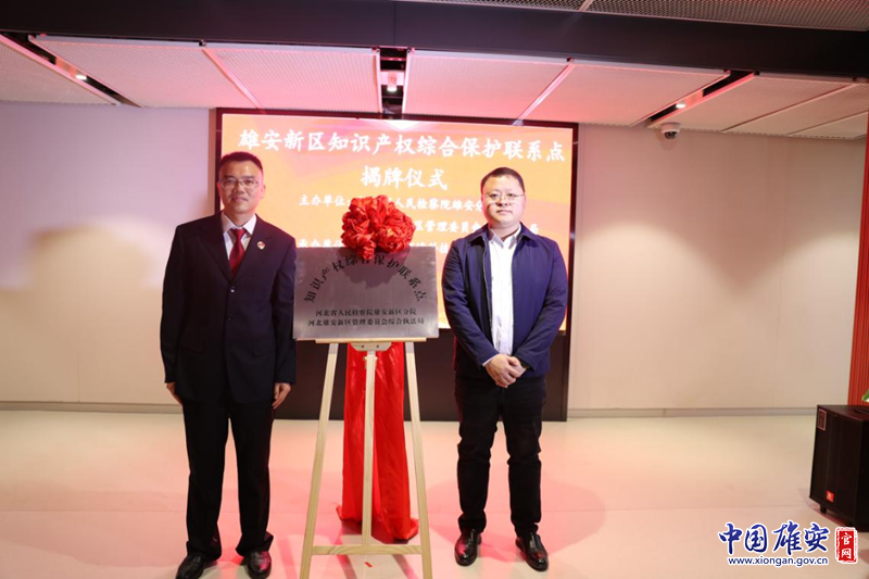 河北省人民检察院雄安新区分院党组成员、副检察长陈健与雄安新区综合执法局市场监管一部部长李学辉共同为“知识产权综合保护联系点”挂牌。河北省人民检察院雄安新区分院供图
