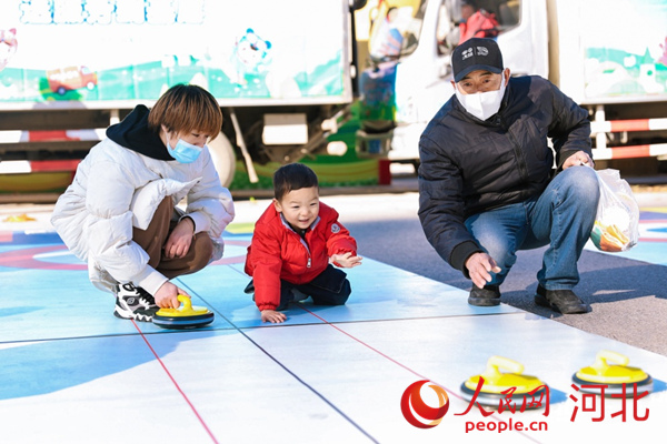 在正定县塔元庄村,小朋友在家长的带领下体验陆地冰壶。主办方供图