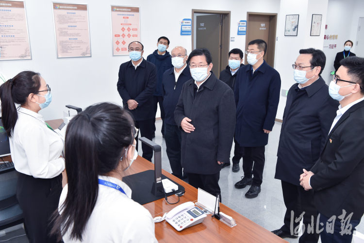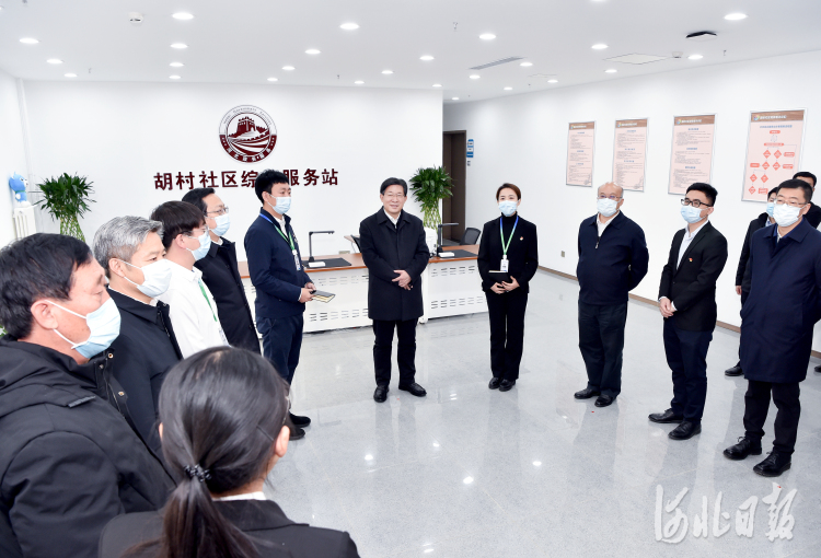 12月4日,省委宣讲团团长、省委书记、省人大常委会主任王东峰到雄安新区宣讲党的十九届六中全会精神并调研检查。这是王东峰、王正谱在胡村社区党群服务中心,看望慰问社区工作者。 河北日报记者赵海江 摄