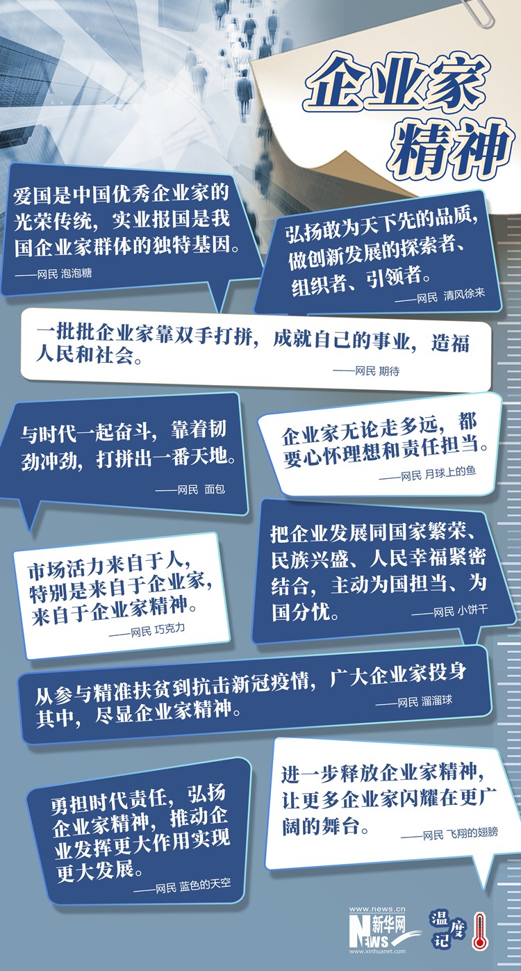 优秀企业家和企业家精神,是改革创新、推动经济增长的重要因素。正如网民所说:“企业家无论走多远,都要心怀理想和责任担当”“主动为国担当、为国分忧”。企业家精神是宝贵的社会资源,是实现高质量发展的有力支撑,要走向更辉煌的未来,企业家们要在爱国、创新、诚信、社会责任和国际视野等方面不断提升自己。