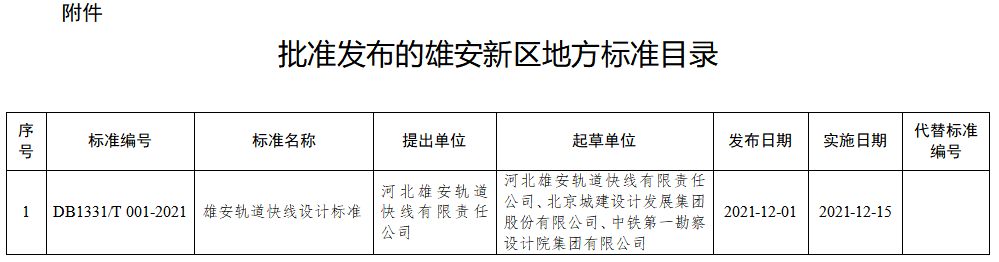 河北雄安新区管理委员会改革发展局会同河北雄安新区管理委员会规划建设局于12月1日联合发布了《雄安轨道快线设计标准》雄安新区地方标准,现予以通告(详细目录见附件)。