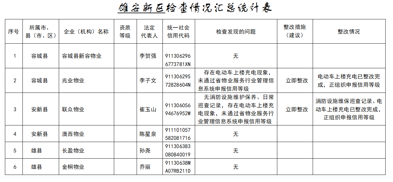 此次专项检查,按照“双随机一公开”的要求,随机抽取了容城县新容物业服务有限公司、容城县兆业物业服务有限公司、安新县联众物业服务有限公司、安新县澳西物业服务有限公司、雄县长盈物业服务有限公司、雄县金桐物业服务有限公司等六家物业服务企业进行检查。
