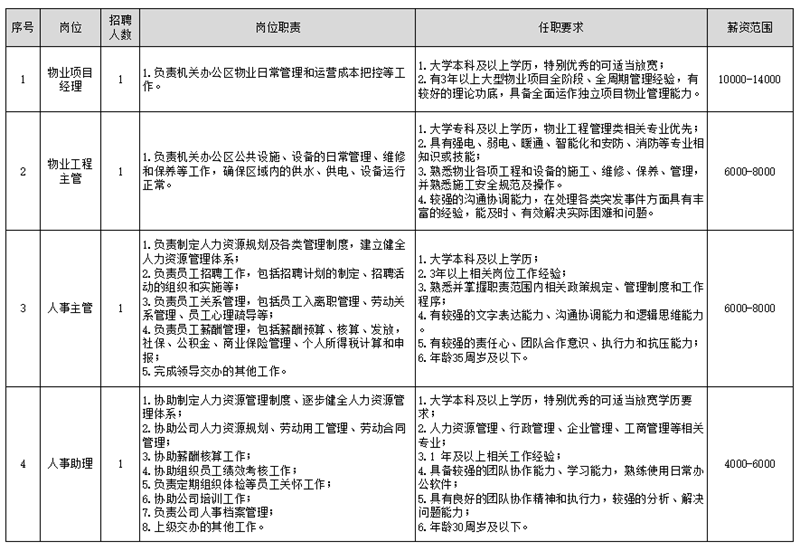 招聘人数4人:物业项目经理1人、物业工程主管1人、人事主管1人、人事助理1人。