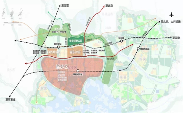 雄安郊野公园位于雄安新区北部,东临京雄高速,南接容易线,与高铁白洋淀站毗邻,一小时到达北京、天津、石家庄、大兴国际机场,是雄安新区起步区南北中轴线上重要景观门户。