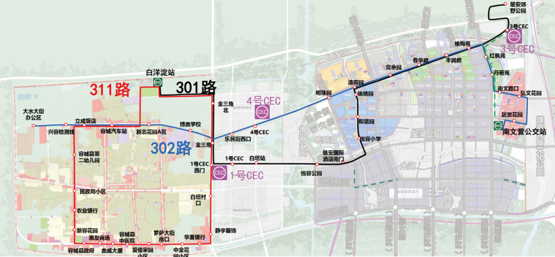 为方便群众出行,根据新区工作安排,自2021年12月20日起开通运营311路公交线路。停靠站点:白洋淀站、金三角、1号CEC西门、白塔村口、静宇服饰、华夏银行、中金花园小区、容城县中医院、奥威大厦、惠友商城、容城县政府、新容花园、农业银行、民政局小区、容城县第二幼儿园、立成饭店、容城汽车站。双向发车,运营时间6:00-21:00。