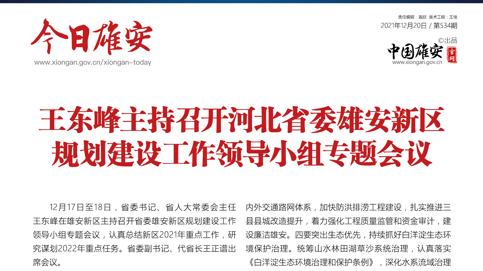 1.12月17日至18日,河北省委书记、省人大常委会主任王东峰在雄安新区主持召开省委雄安新区规划建设工作领导小组专题会议,认真总结新区2021年重点工作,研究谋划2022年重点任务。省委副书记、代省长王正谱出席会议。王东峰强调,要持续用力推进雄安新区建设发展,确保重大国家战略和国家大事顺利实施。