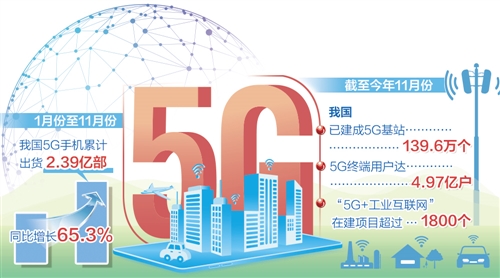 我国5G网络建设和应用正加速推进。截至今年11月份,已建成5G基站139.6万个,5G终端用户达到4.97亿户,“5G+工业互联网”在建项目超过1800个。