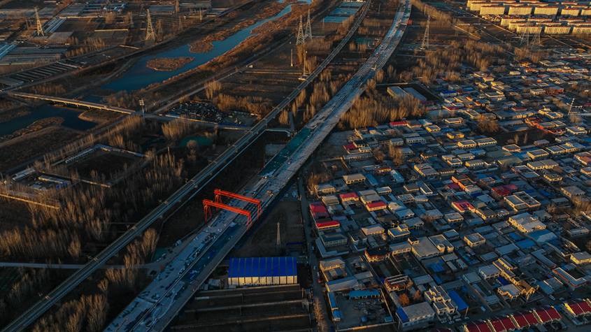 在张北县华恒社区, 一字排开的陆地冰壶赛道前围满了前来体验的群众。不少群众第一次见到陆地冰壶, 眼里满是好奇和兴奋。