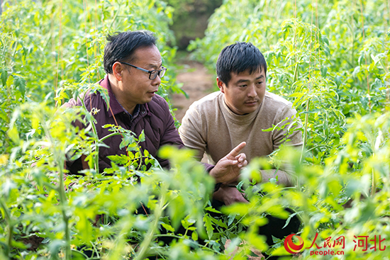 2021年12月16日,在河北省邯郸市肥乡区毛演堡镇张村张世玉种植的水果番茄大棚内,对口帮扶的科技特派员张孟军(左)正在指导其进行田间管理。薛建东 摄