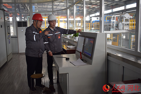 河北工业大学教授王宝奇(左)在河北钢诺新材料科技有限公司查看新产品设备参数。郭永强 摄