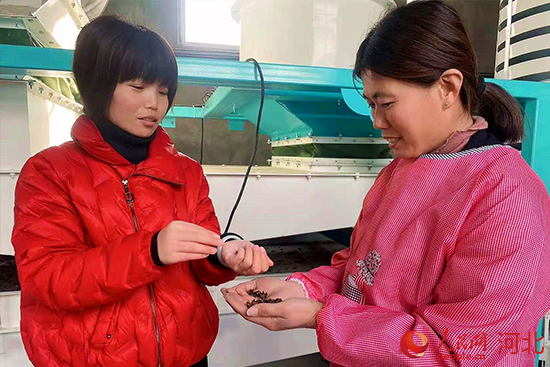 邱县乡镇科技特派员刘丹平(左)在企业指导工人开展文冠果果壳粉碎加工工作。蒋中杰 摄