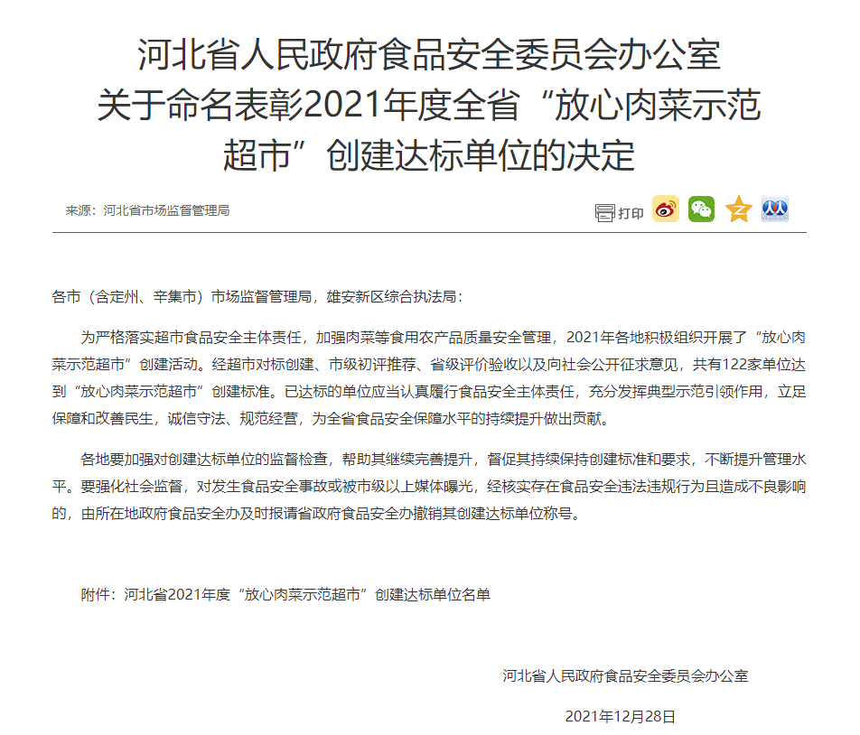 近日,从省市场监督管理局网站获悉,河北省人民政府食品安全委员会办公室发布了关于命名表彰2021年度全省“放心肉菜示范超市”创建达标单位的决定,共有122家单位达到“放心肉菜示范超市”创建标准。