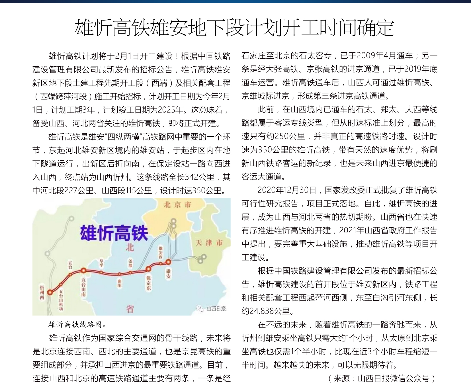 【雄安之声】雄忻高铁计划将于2月1日开工建设