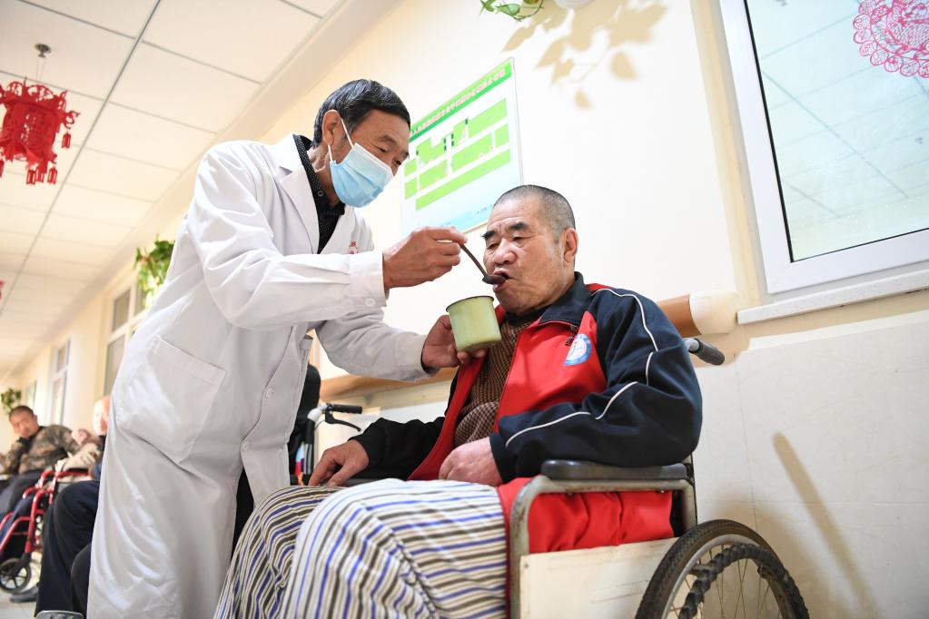 2021年12月28日,河北省景县人民医院医养中心工作人员帮助老人喝水。新华社记者朱旭东 摄