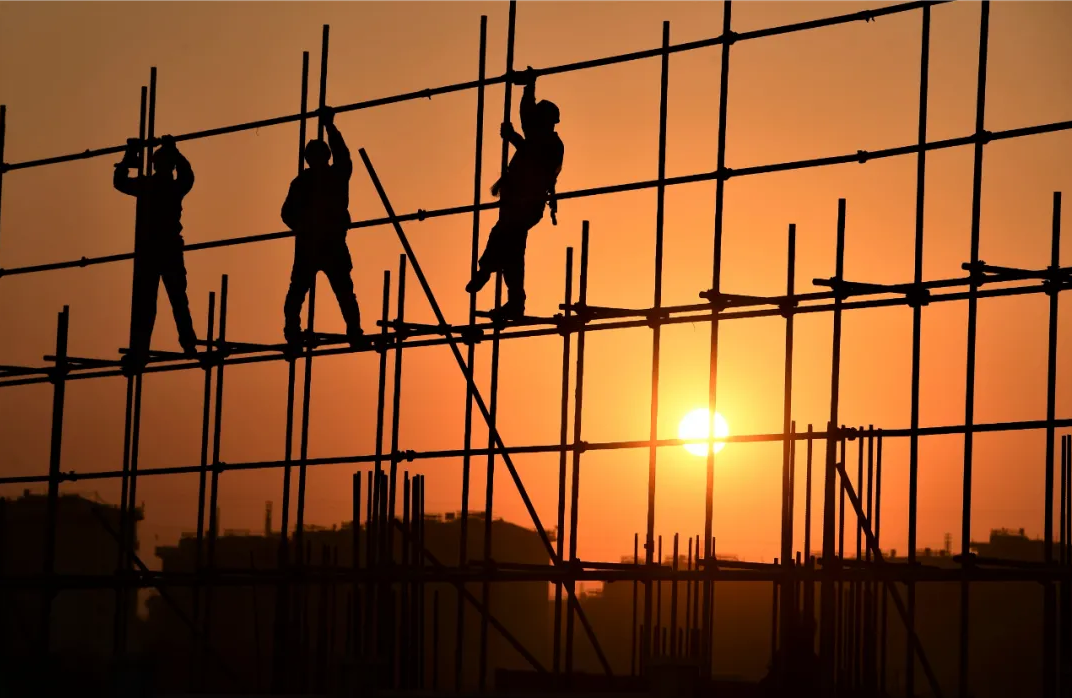 2022年1月1日,在雄安新区容西安置房项目D标段施工现场,工人在新年第一缕阳光的照耀下加紧工作。新华社发(傅新春 摄)