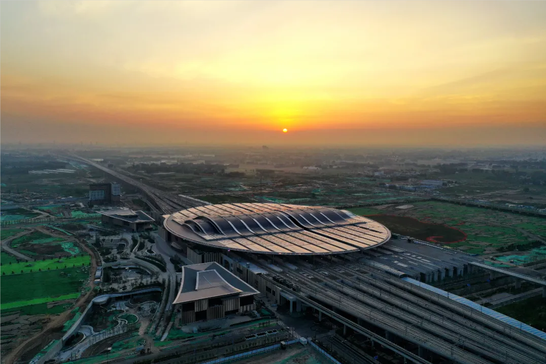 这是2021年7月1日在雄安新区京雄城际铁路雄安站拍摄的日出。新华社记者 牟宇 摄