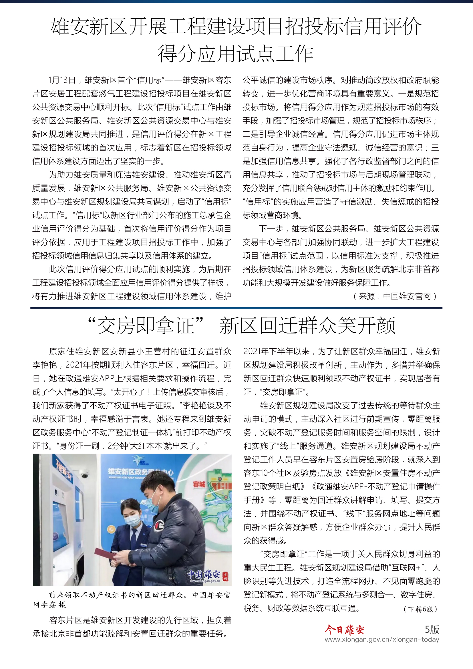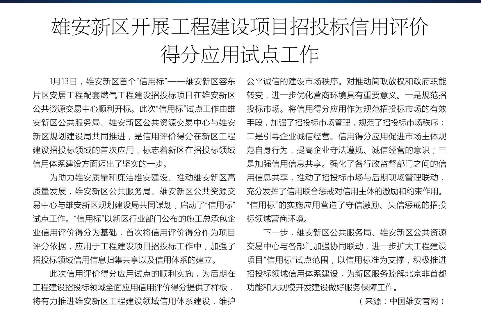 雄安新区开展工程建设项目招投标信用评价得分应用试点工作