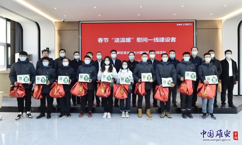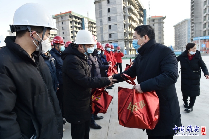 万岷向全国劳模罗岗、“河北大工匠”杨忠等春节留守建设者发放了春节慰问品。雄安新区党群工作部供图