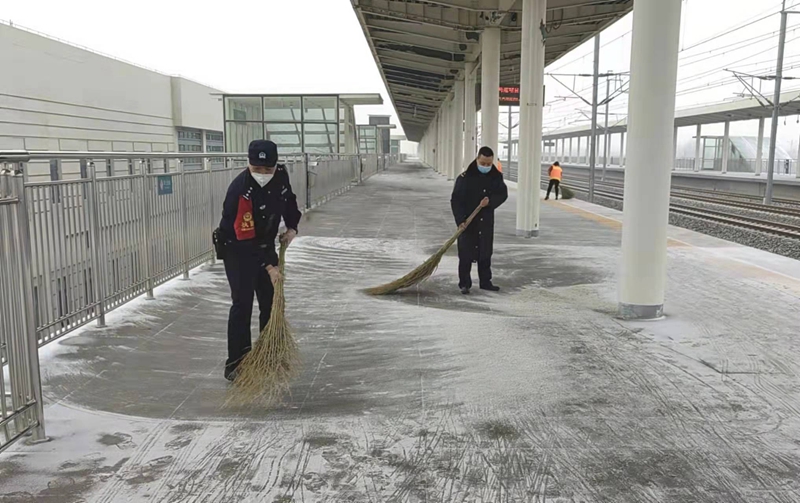 据北京铁路公安局石家庄公安处霸州西站派出所民警介绍,此次降雪虽然强度不大,但由于当前气温较低,容易造成路面湿滑结冰,从而导致交通事故和滑倒摔伤情况。对此,霸州西站派出所及时增派警力,积极联合铁路相关部门开展扫雪除冰作业,加强火车站客流引导和秩序维护,强化铁路线路巡逻防控,全力保障乘车旅客和沿线群众生命财产安全。