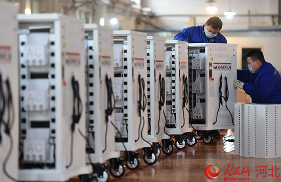 河北海捷现代教学设备公司车间工作人员正在组装智能充电车。苑立伟 摄
