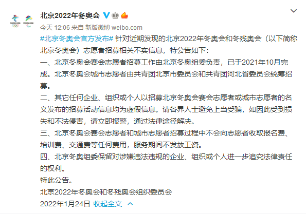 24日,针对近期发现的北京2022年冬奥会和冬残奥会(以下简称北京冬奥会)志愿者招募相关不实信息,北京2022年冬奥会和冬残奥会组织委员会发布公告: