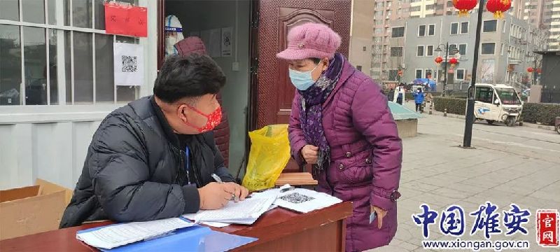 容城县谷丰印象小区疫情防控工作人员细心为群众答疑解惑。中国雄安官网李鑫 摄