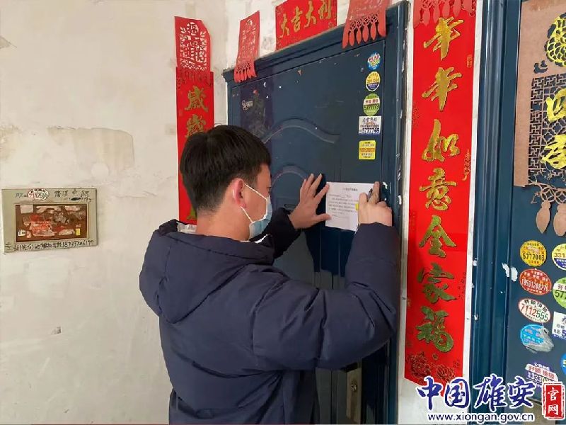 雄县疫情防控工作人员在群众家门上贴温馨提示。雄县县委宣传部供图