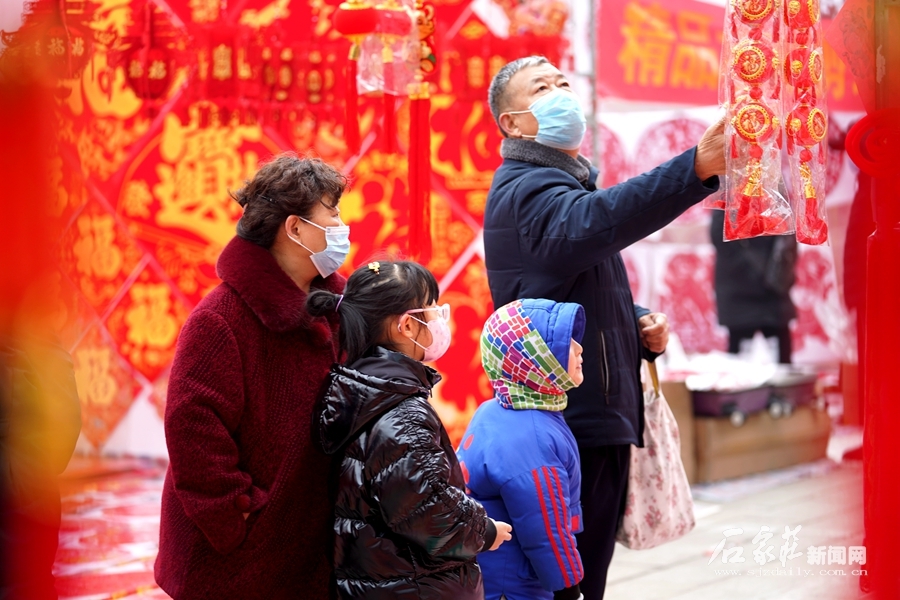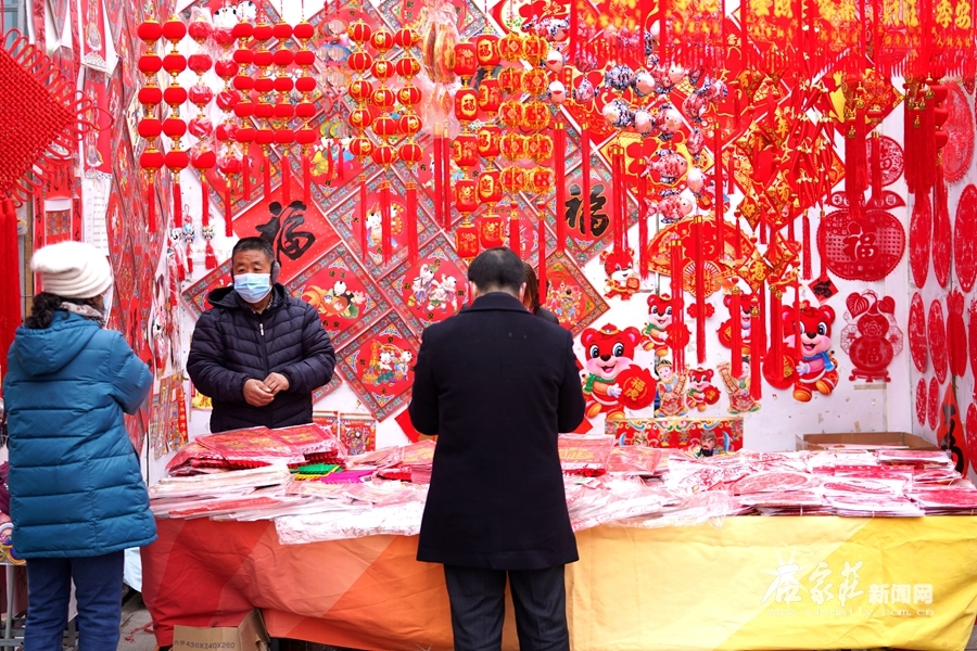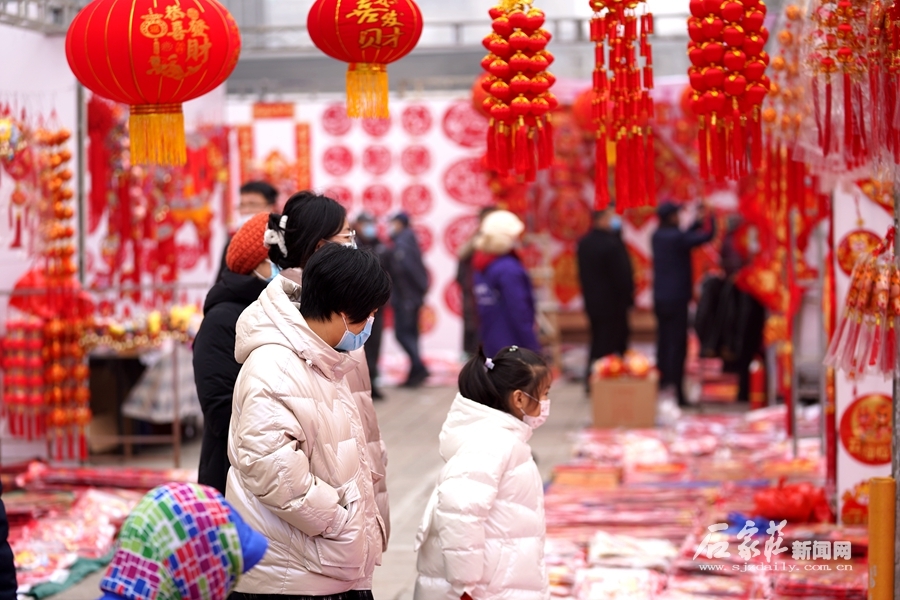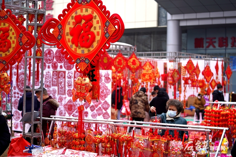 1月26日,记者在石家庄东大街国际会展中心内看到,这里的年货市场热闹非凡,灯笼、剪纸、春联、窗花、中国结等富有文化特色的年货产品吸引了市民的购买。吉祥的图案、大红的“福”字、火红的灯笼……这些必不可少的“红色”年货,让市场里一片红火,走进其中感受到扑面而来的年味。(记者双鹏飞 兰立飞 摄)