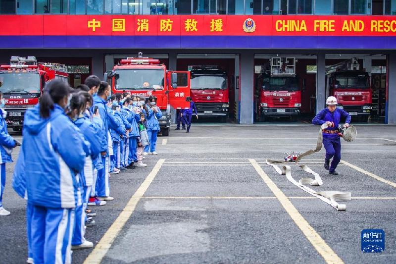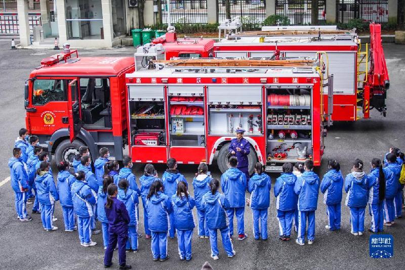 1月12日,学生们在乌当区消防救援大队观看演练。新华社记者陶亮 摄