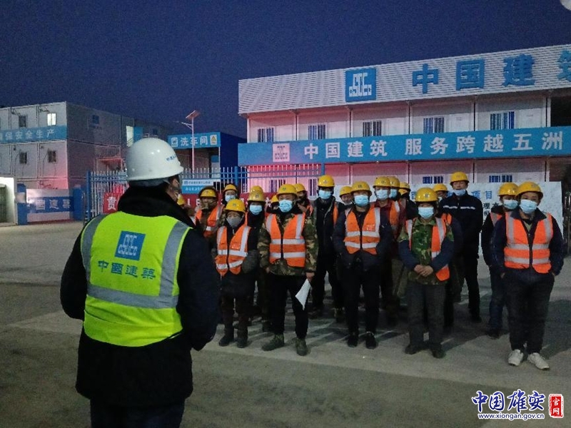 清晨,项目相关负责人正在给工友们进行班前教育。中国雄安集团公共服务管理公司供图