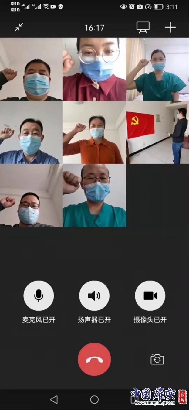 天宏一区医学观察点医务工作人员召开线上党员会议。安新县医院供图