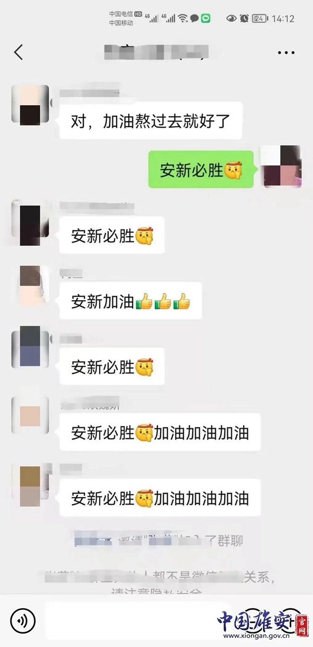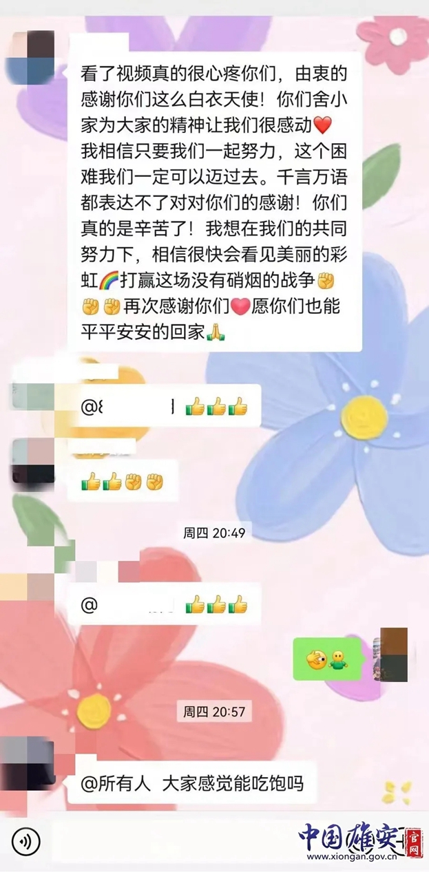 锦江之星医学观察点微信群隔离人员的温暖留言。安新县中医院供图