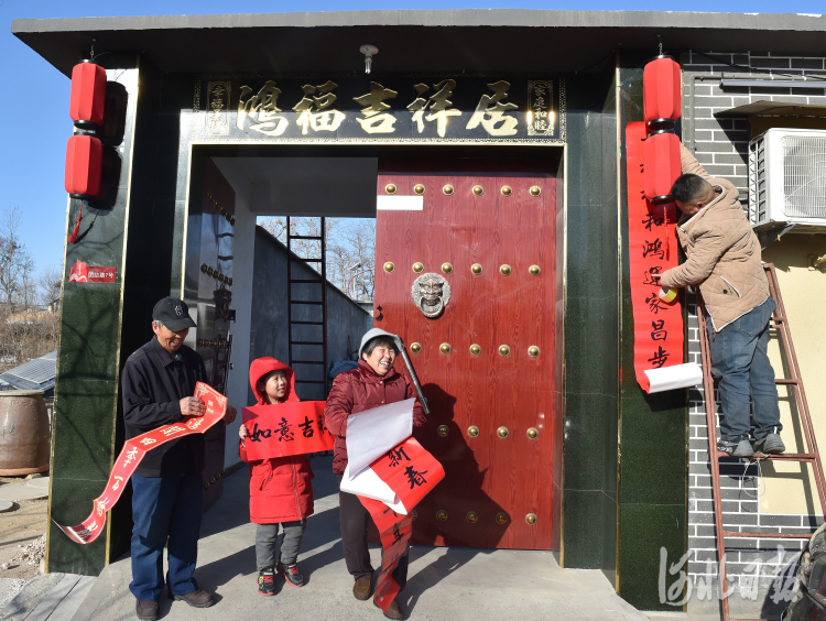 2022年1月31日,平山县西柏坡镇北庄村村民王风茹(左三)一家人一起动手贴春联,过大年。河北日报记者贾恒 摄