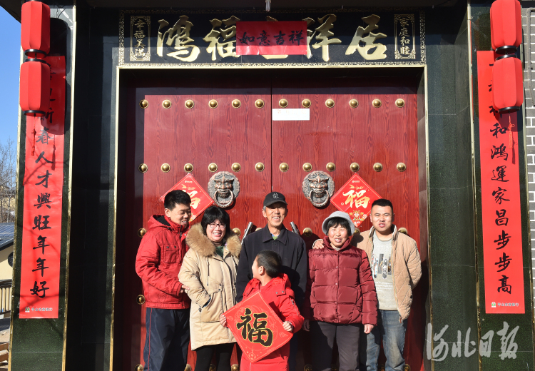 2022年1月31日,平山县西柏坡镇北庄村村民王风茹(右二)在贴好春联的大门前合影留念。河北日报记者贾恒 摄