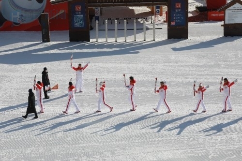 15时30分左右,火炬沿初级雪道区南侧雪道向西行进至初级滑行区,由初级滑行区底端向顶端传递。此时,由当地群众组成的舞龙队加入火炬传递队伍。舞龙是张家口传统民俗文化活动之一。 舞龙时,龙跟着绣球做各种动作,不断地展示扭、挥、仰、跪、跳、摇等多种姿势。在火炬传递现场,两条巨龙闪转腾挪,与奥运火炬遥相呼应,形成“二龙戏珠”的美好寓意。