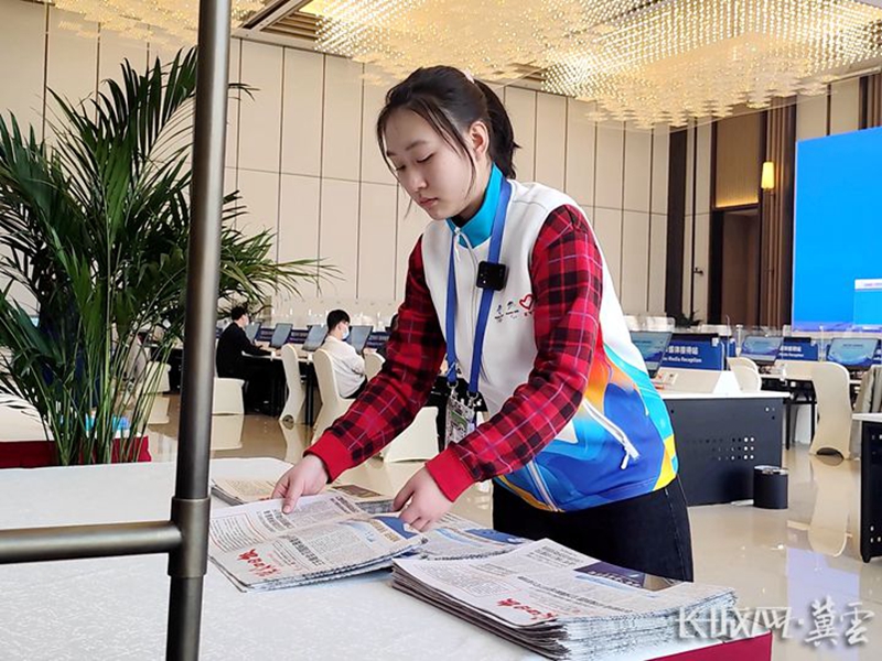 志愿者陈姝婕整理媒体公共工作区的资料。记者闫航 摄
