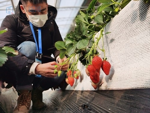 为什么这里的草莓口感这么好,李伟斌向大家进行了简单介绍:“第一,是这里的地域条件。尚义县位于河北省西北部,地处北纬41°,这正处于草莓栽培最佳区域范围内,这里属于高寒半干旱地区,最高气温不超过24℃,恰好草莓果实发育期适宜温度为18~23℃。再加上尚义县海拔1200米左右,气候冷凉、昼夜温差大,无霜期115-120天。得天独厚的自然生态优势,为草莓的错季栽培创造了有利条件。”