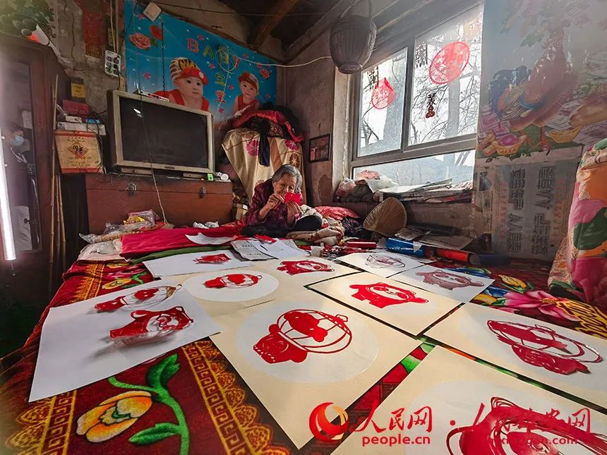 剪纸的老人叫孙秀芹,今年95岁。热爱剪纸的她多年来创作出不少精美作品,深受喜爱。