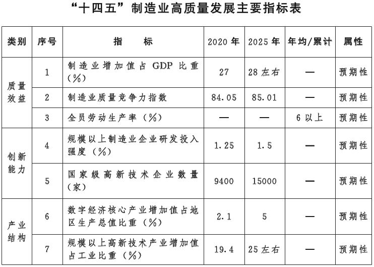质量效益迈上新台阶。制造业增加值占GDP比重稳定提升,达到28%左右,制造业质量竞争力指数提高到85.01,先进制造业重点产品质量达到国际先进水平。制造业投资和技术改造投资保持合理增速,全员劳动生产率年均增长6%以上。