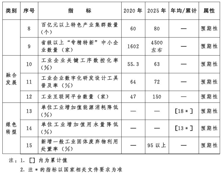 到2025年,全省制造业比重稳定提升,基本形成制造业高质量发展良好生态和现代化制造业体系,战略性新兴产业支撑能力跃升,实现创新能力强、生产效率高、供给品质优、产业结构好、区域更协调、环境更友好的高质量发展,产业基地(园区)和产业集群综合竞争力明显增强,掌握核心技术的领军企业、单项冠军企业和“专精特新”中小企业不断涌现,产业基础高级化和产业链现代化水平持续提高,京津冀产业协同发展迈向更高层次,全国产业转型升级试验区建设取得重大进展,基本建成制造强省。