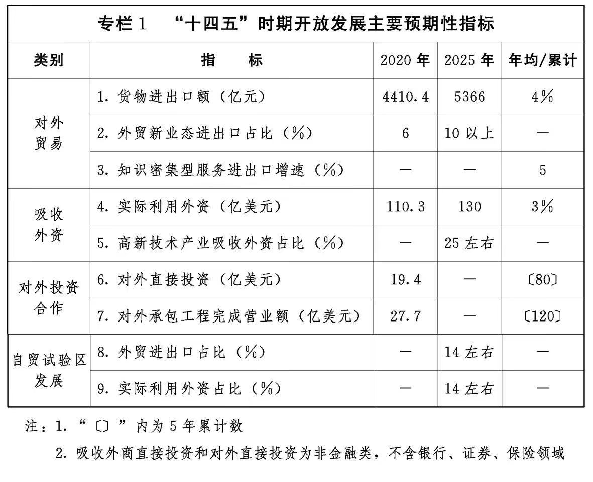 高质量开放型经济获得新发展。对外贸易保持适度平稳增长,到2025年货物进出口总额达到5366亿元。服务贸易实现高质量发展,知识密集型服务进出口增速快于货物贸易。全球资源配置能力明显提高,到2025年实际使用外资突破130亿美元,“十四五”时期对外直接投资累计完成80亿美元。开放型经济质量明显提升,外贸外资结构更加优化,机电产品和高新技术产品出口占比、服务业利用外资和高新技术产业利用外资占比进一步提高。