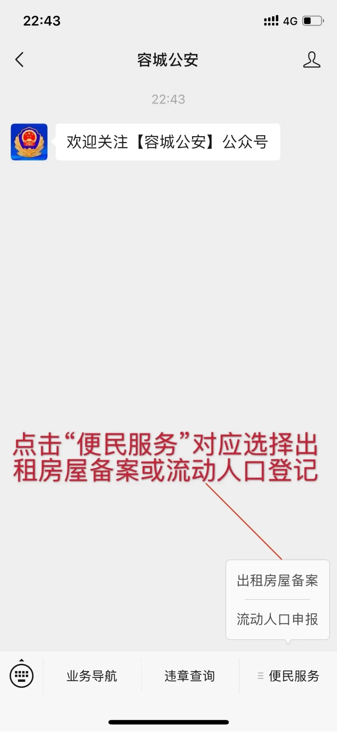 2.进入“容城公安”微信公众号后,点击底部的“便民服务”菜单,选择相应的申报菜单,进入申报页面。