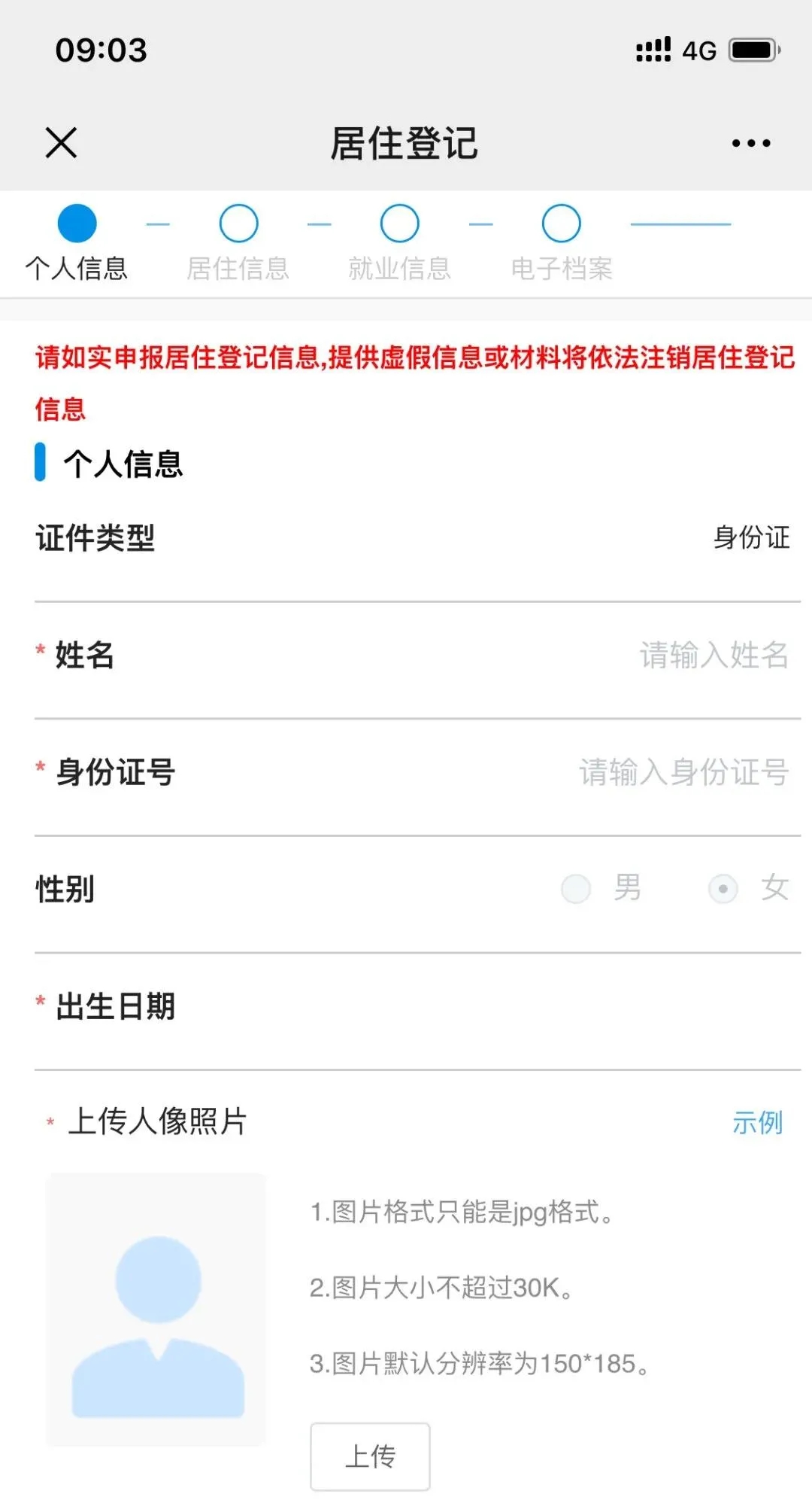 3.按要求填写真实信息并上传相关照片后,点击“提交”,即完成申报程序。属地派出所收到申报信息后将按照有关规定组织审核,经派出所核查申报信息属实符合办理条件,办理登记满六个月后,可到居住地派出所直接办理居住证。