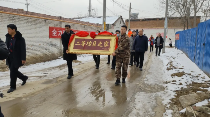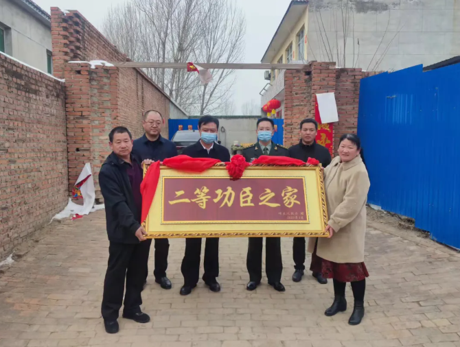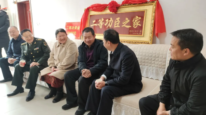 在郝永波家中,相关慰问领导为郝永波的父母送上“二等功臣之家”牌匾和慰问金,并向其表示祝贺,感谢家属在背后的默默支持,为祖国、部队培养出优秀的人才,感谢他对国防事业的支持和贡献,同时希望他们能在今后继续支持和鼓励孩子,能够在部队安心服役、保家卫国,争取再立新功。