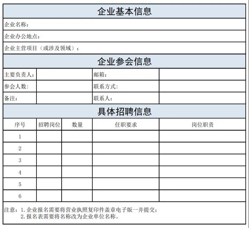 企业报名和求职者报名需下载报名表(附件1和附件2)文件,填写后将报名表电子版与企业营业执照复印件盖章电子版,一并提交至组委会邮箱:(703083313@qq.com),并将邮件名称更改为:春风行动企业报名+企业名称。