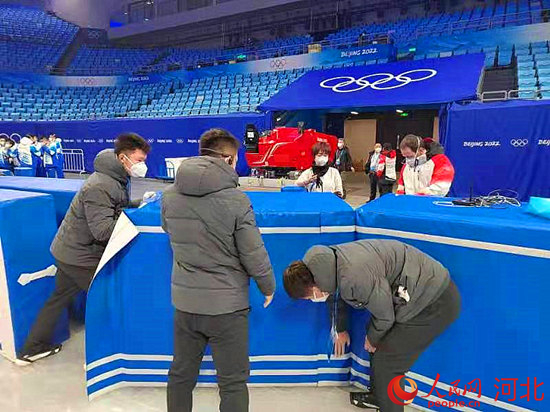 工作人员正在比赛场地安装防护垫。杨计军供图