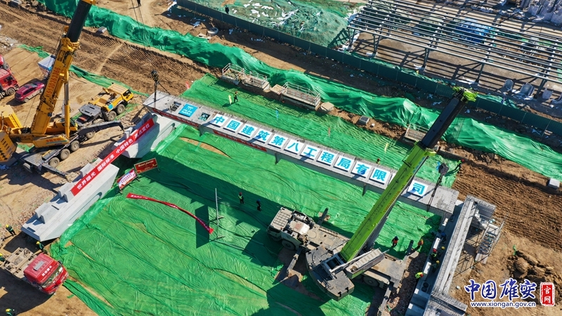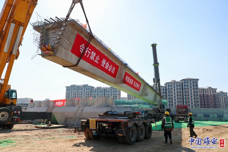 项目施工现场,第一根预制箱梁正准备安装。中国雄安官网高盟 摄